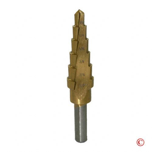 A Professional Quality Titanium Coated M2 HSS 3/16" - 1/2"-Drill Bit, High speed, titanium nitride coated steel, 3/16" to 1/2" Capacity stepped in 6 - 1/16" increments: 3/16", 1/4", 5/16", 3/8", 7/16" and 1/2", Fluted design for fast, smooth cutting, Automatically deburrs holes as you drill, 1/4" shank