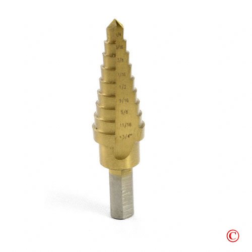 A Professional Quality Titanium Coated M2 HSS 3/16" - 7/8"-Hex Shank Drill Bit, High speed, titanium nitride coated steel, Stepped in 12 - 1/16" increments: 3/16", 1/4", 5/16", 3/8", 7/16", 1/2", 9/16", 5/8", 11/16", 3/4", 13/16" and 7/8", Fluted design for fast, smooth cutting, Automatically deburrs holes as you drillThis website is a participant in the Amazon Services LLC Associates Program, an affiliate advertising program designed to provide a means for sites to earn advertising fees by advertising and linking to amazon.com