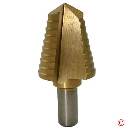 A Professional Quality Titanium Coated M2 HSS 13/16" - 1 3/8" 9-Step Drill Bit * High speed, titanium nitride coated steel * Stepped in 1/16" increments * Fluted design for fast, smooth cutting * Automatically deburrs holes as you drill * Step sizes: 13/16", 7/8", 15/16", 1", 1 1/16", 1 1/8", 1 3/16", 1 1/4", 1 5/16", 1 3/8" * Beveled Shank